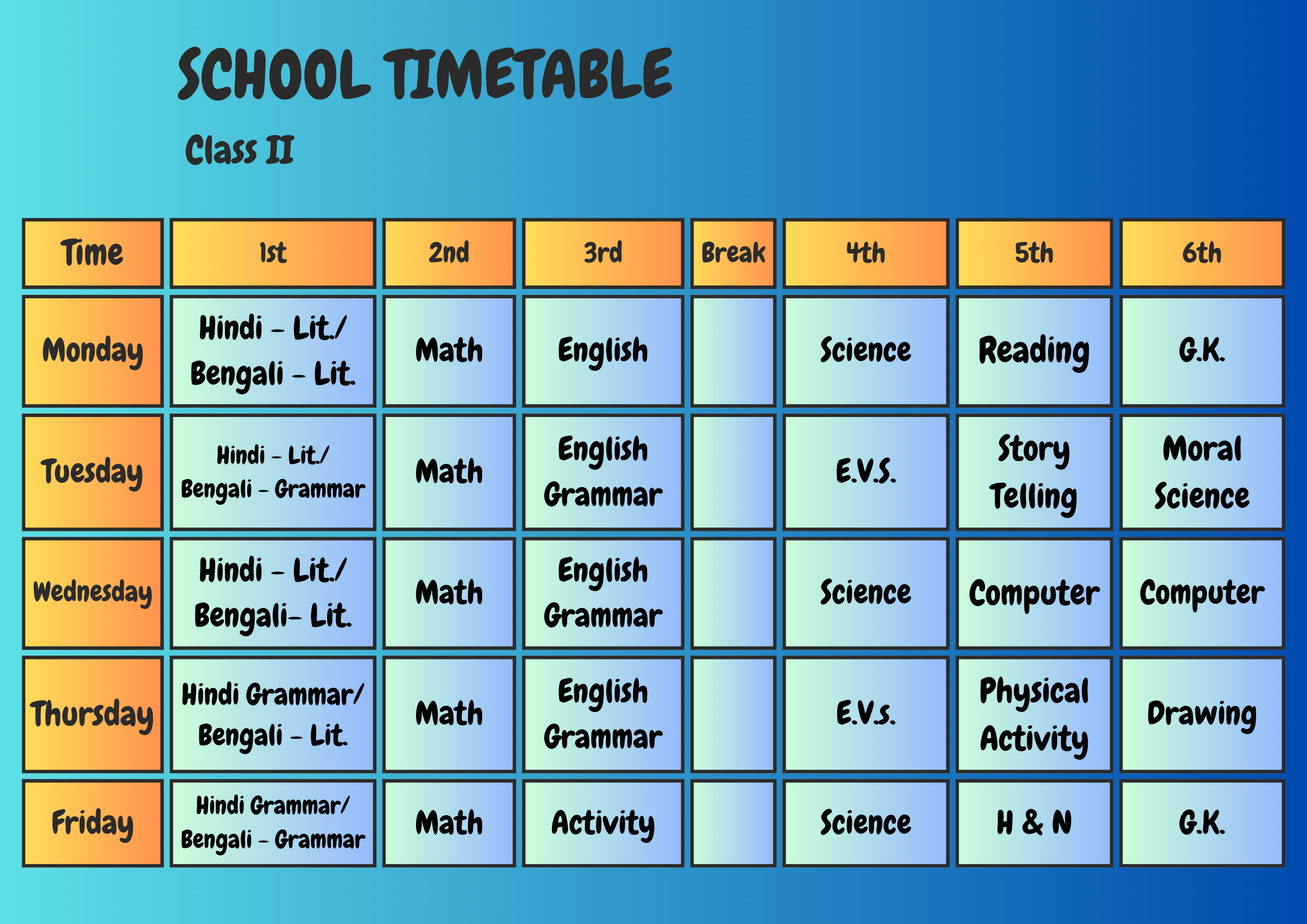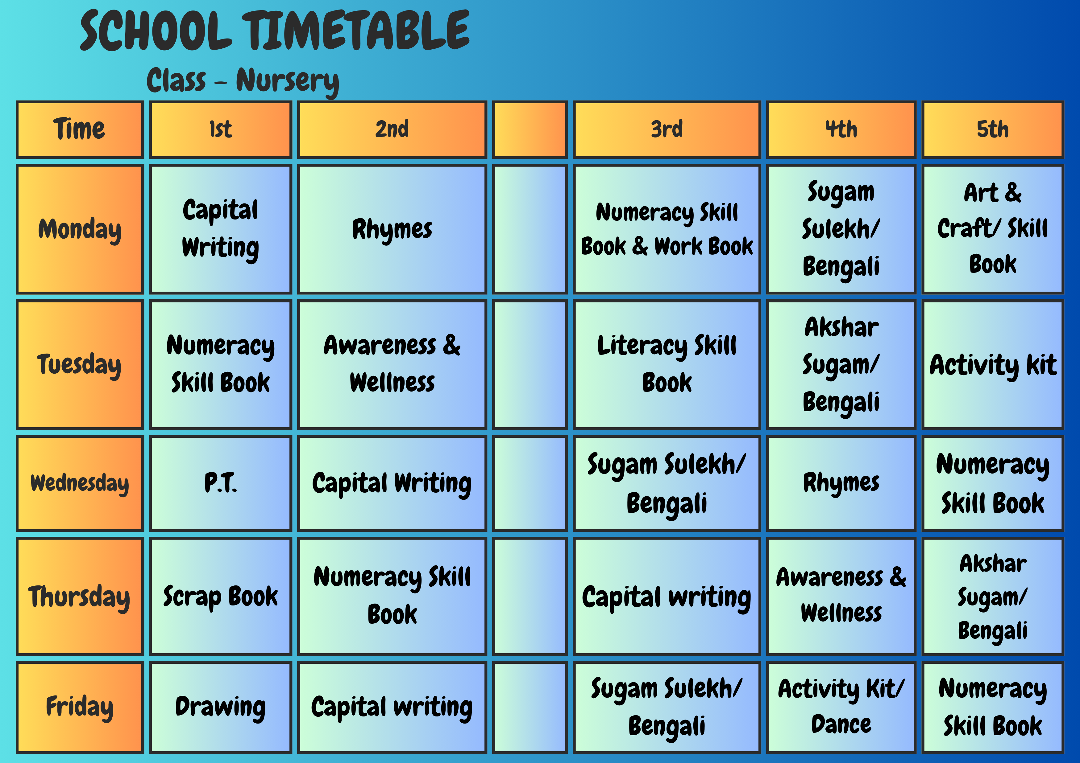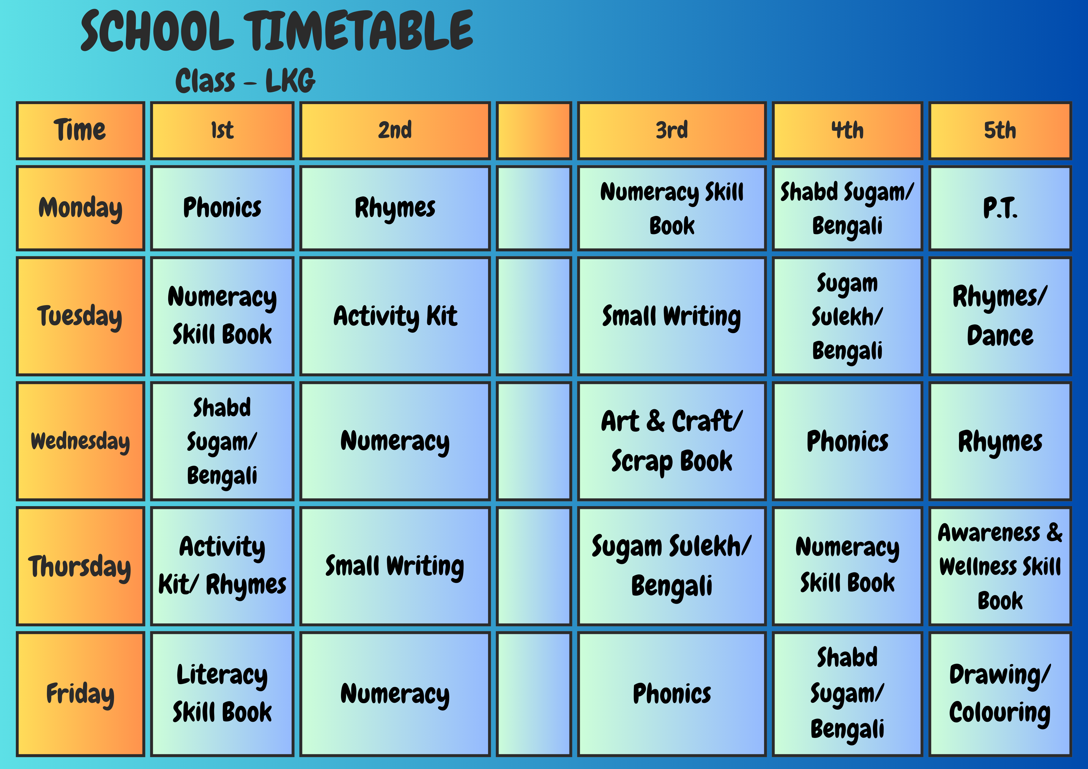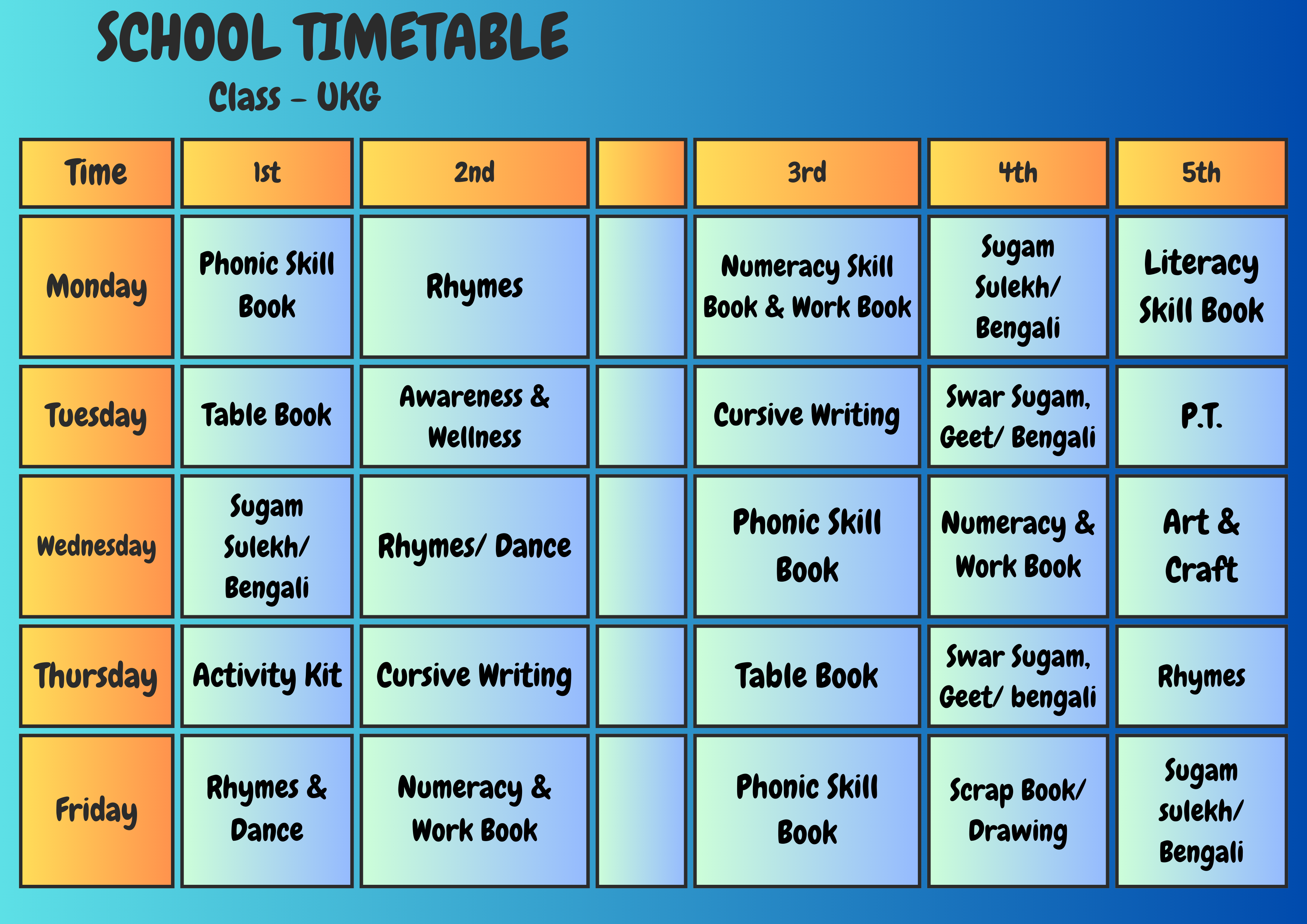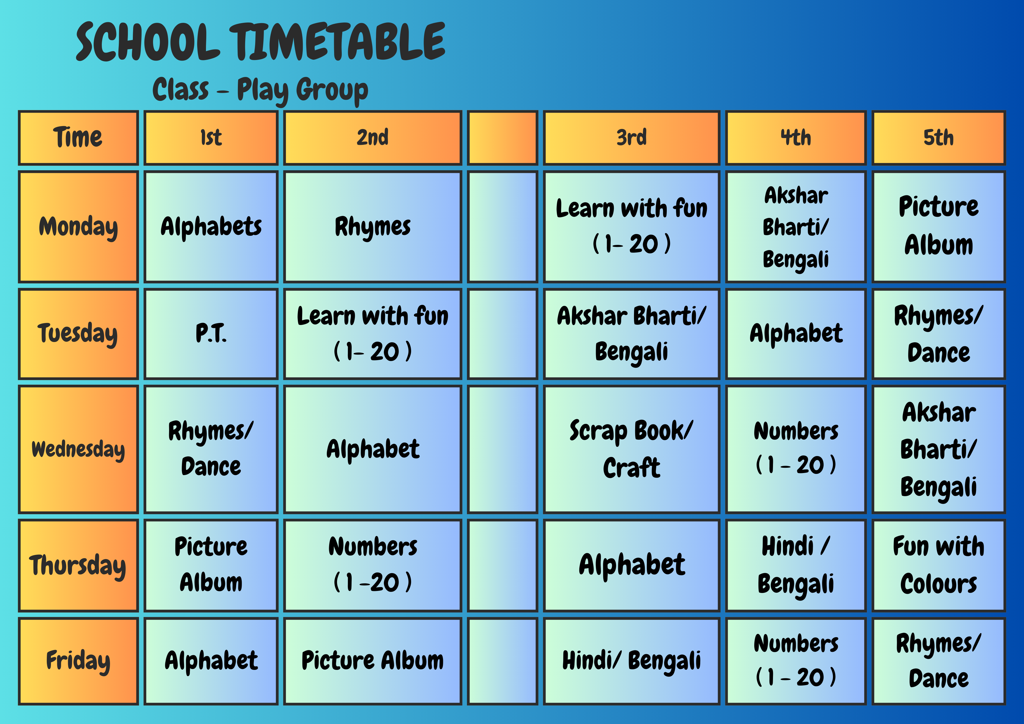 Class Schedule Play Group Download Now ! Nursery Download Now ! LKG Download Now ! UKG Download Now ! I Download Now ! II Download Now ! III Download Now ! IV Download Now ! V Download Now ! VI Download Now !