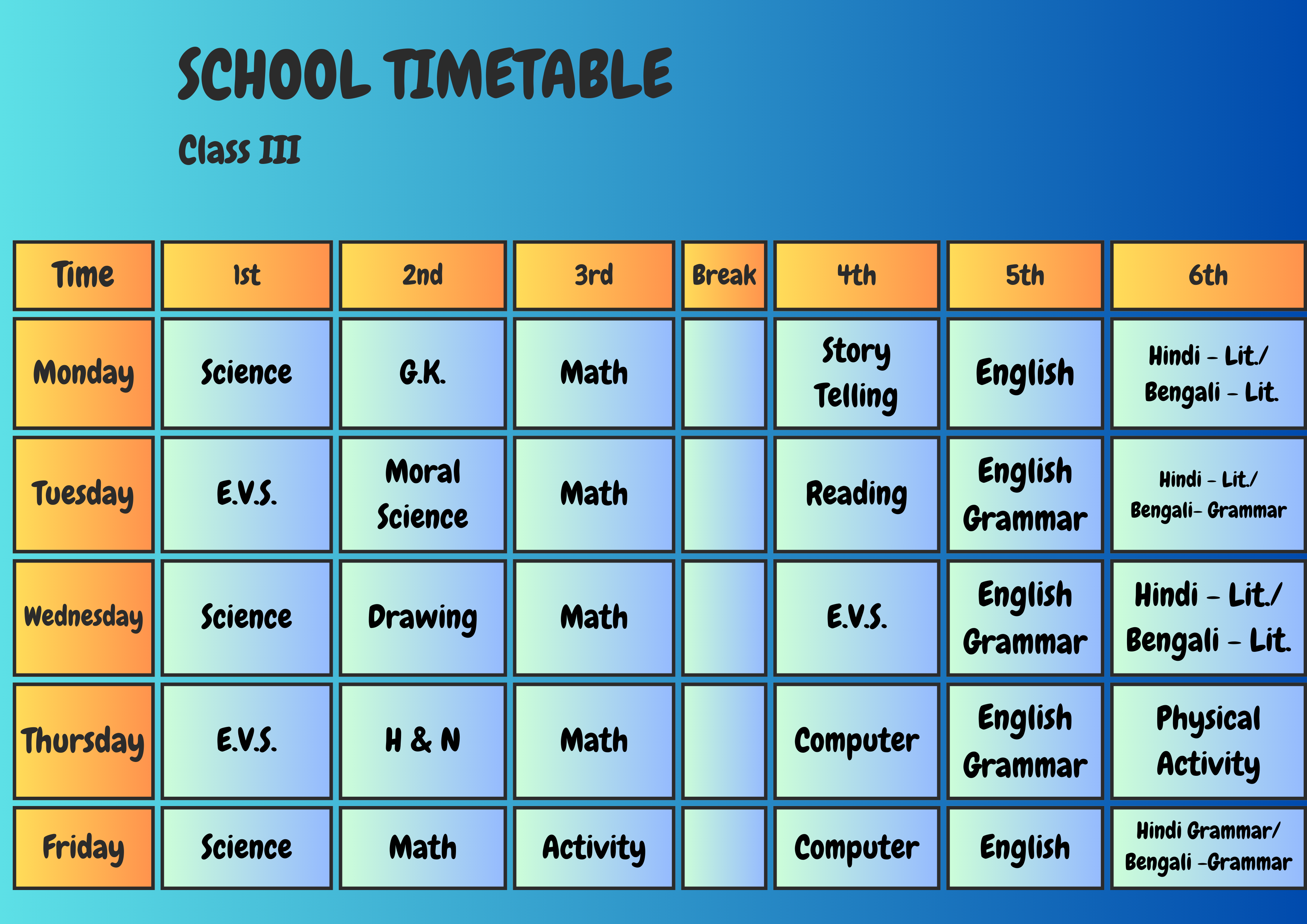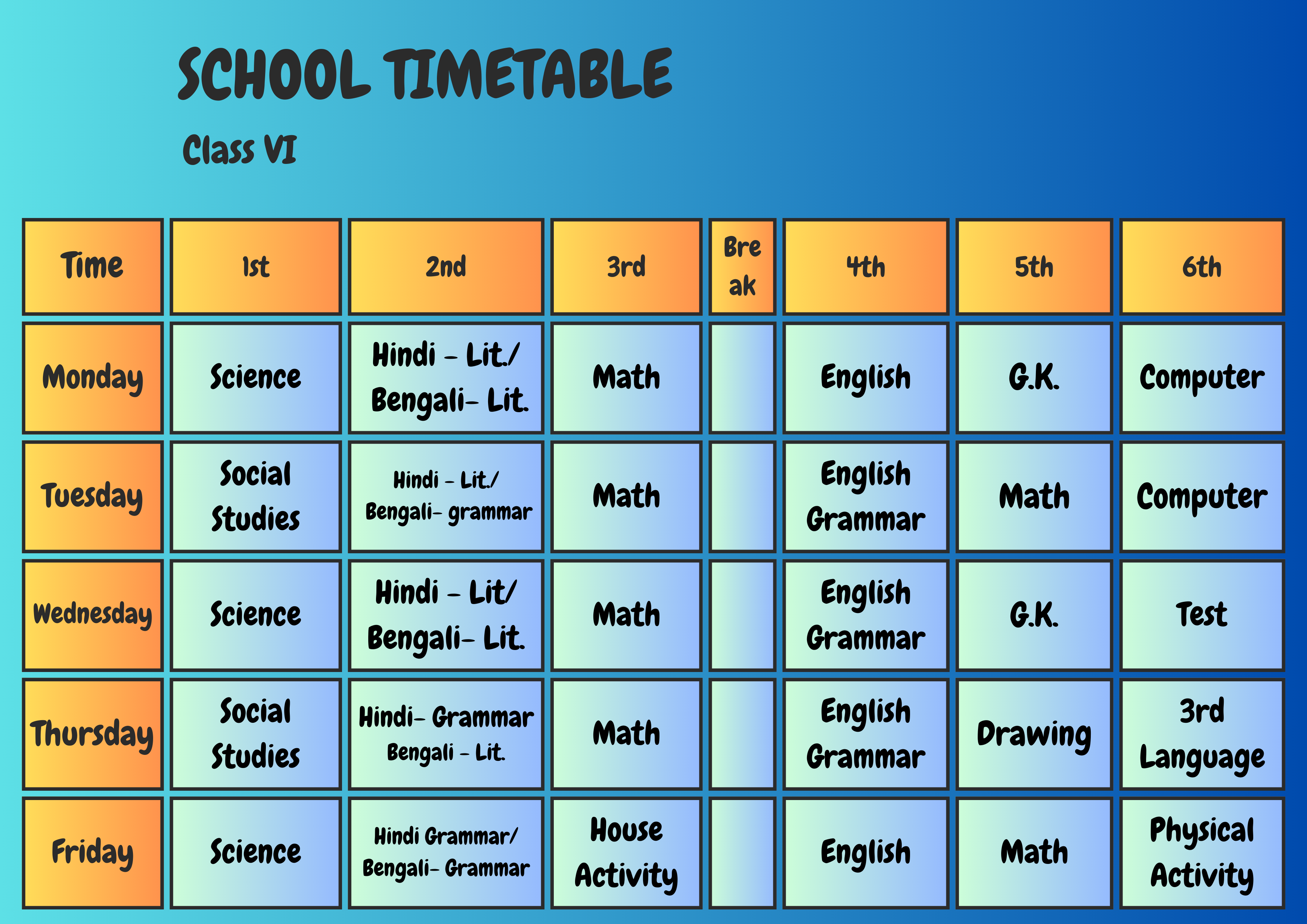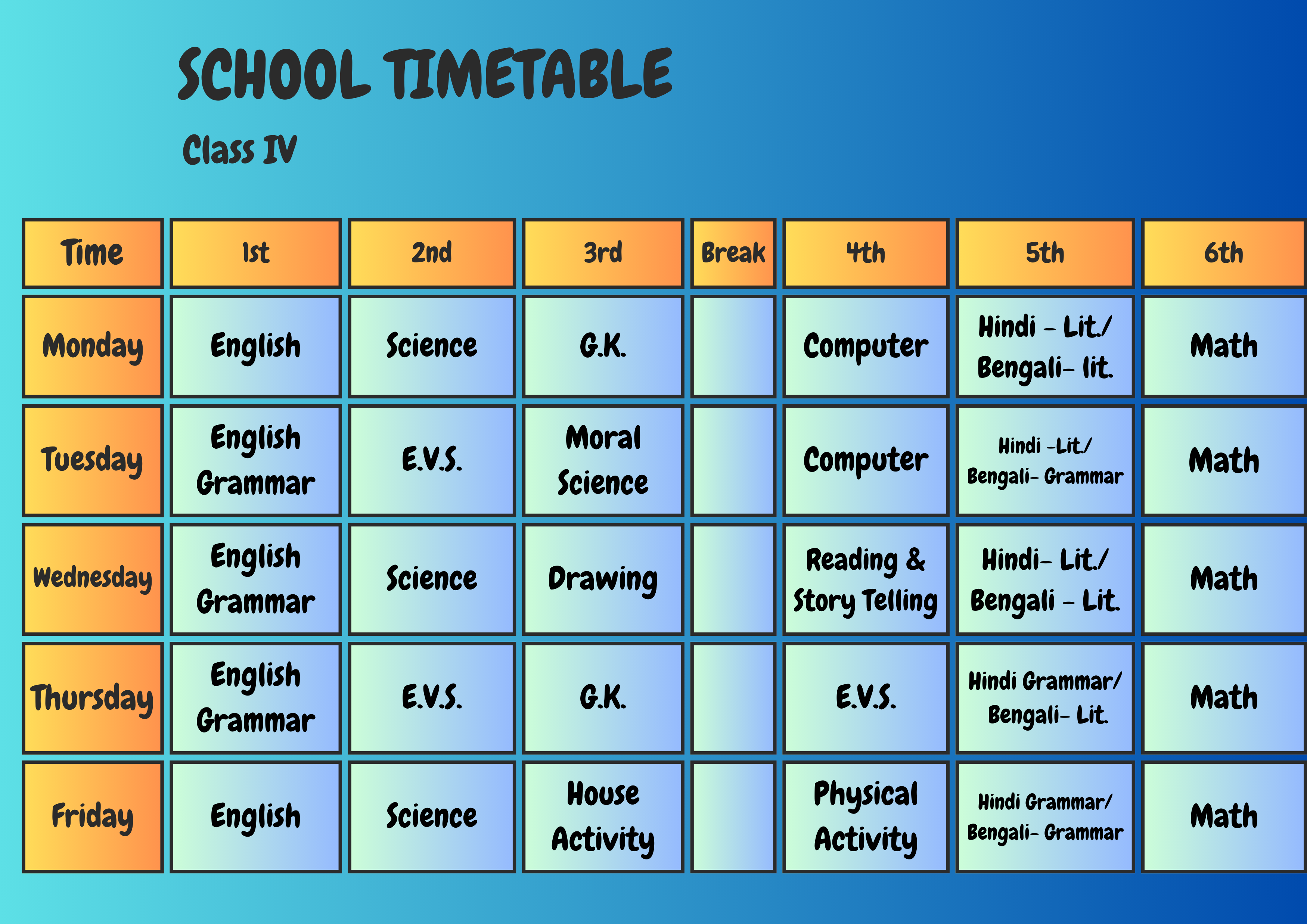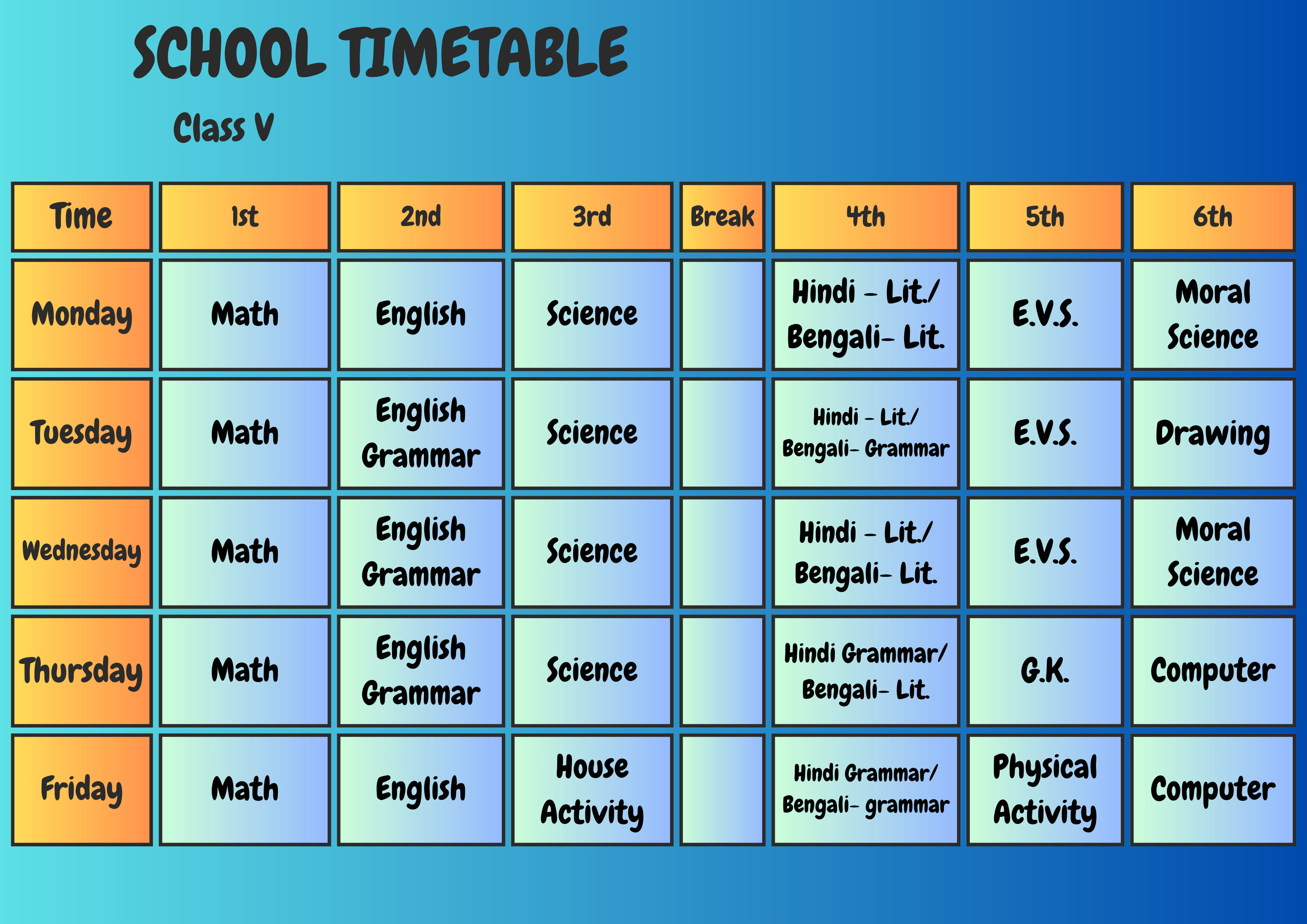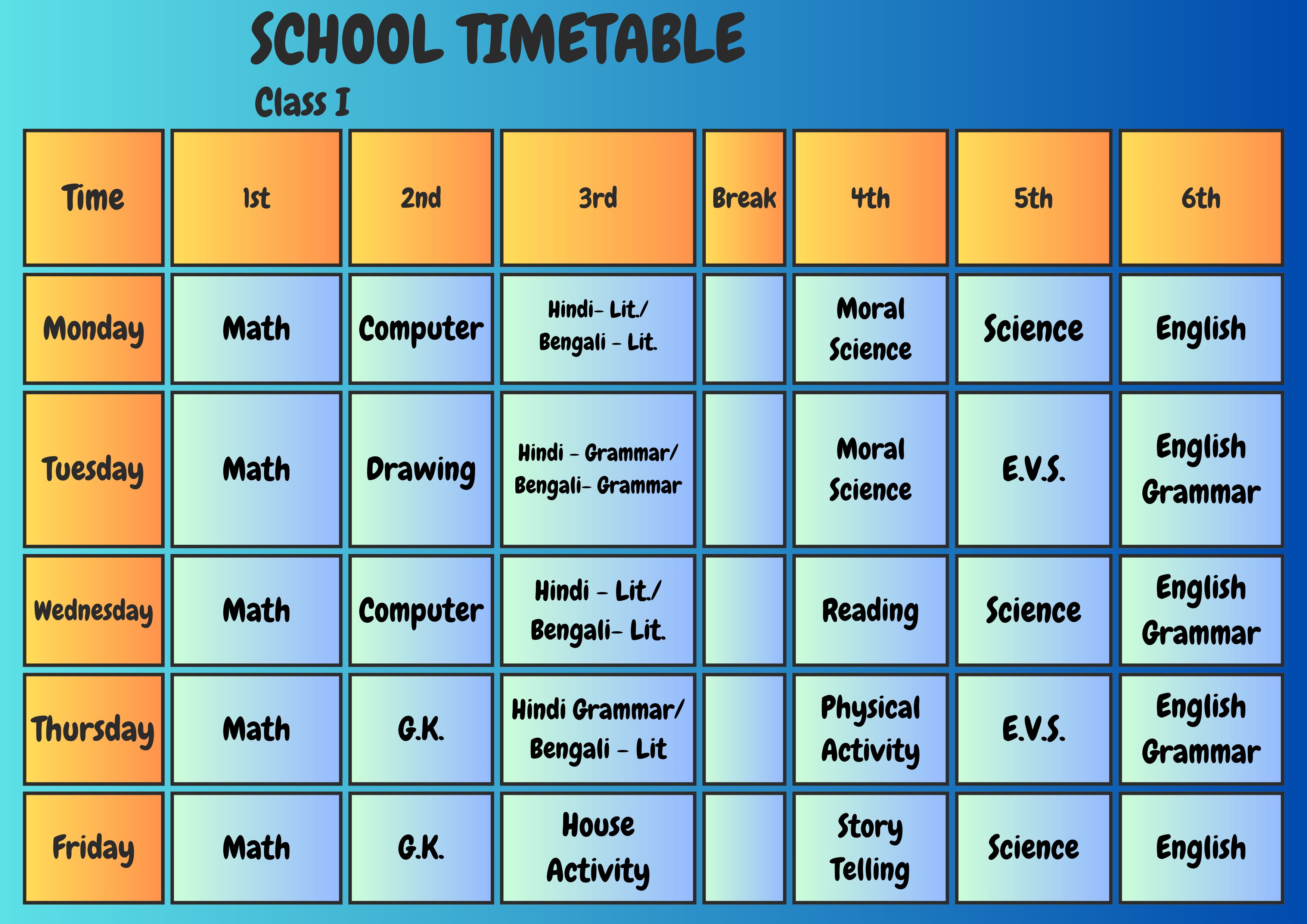 Class Schedule Play Group Download Now ! Nursery Download Now ! LKG Download Now ! UKG Download Now ! I Download Now ! II Download Now ! III Download Now ! IV Download Now ! V Download Now ! VI Download Now !